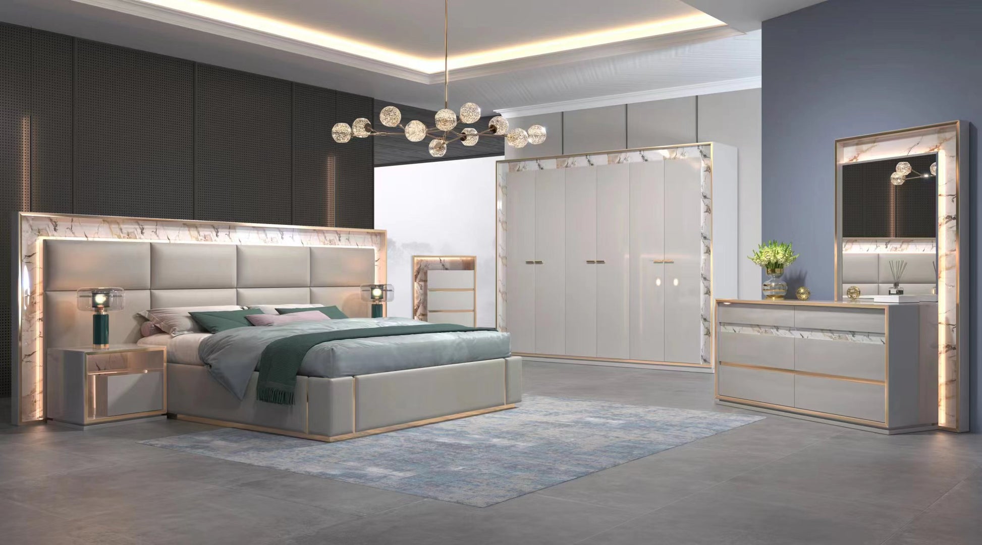 A modern luxury bedroom. It features a plush bed with an elegant headboard, stylish bedside tables with lamps, and a sophisticated chandelier that adds a touch of glamour. There are sleek, high-gloss wardrobes offering ample storage space, and a chic dresser with a mirror, complemented by a decorative plant. The overall color palette, with its blend of neutral tones and metallic accents, creates a refined and upscale atmosphere, perfect for a contemporary and comfortable sleeping space.